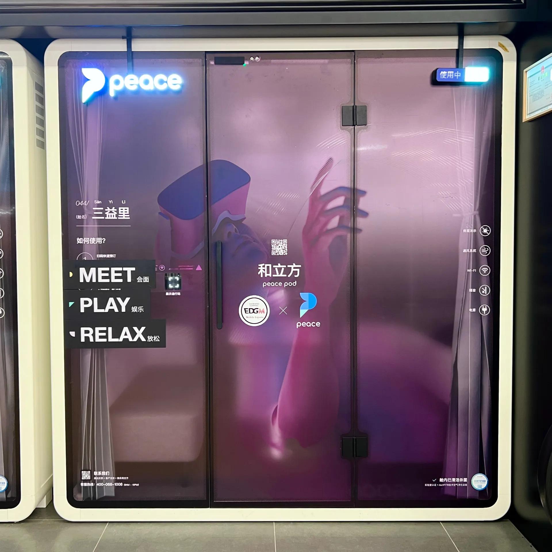 Peace is the world's first Privacy On Demand service, a city-wide network of smart private 'Peace Pods' in shopping malls, office buildings, residential complexes, transportation hubs, and other buildings. DIRECTIONS: KNOWIN店铺对面手扶梯旁